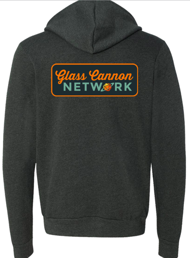 These absurdly comfortable hoodies are Bella + Canvas Unisex Sponge Fleece Full-Zip Hoodies in Dark Grey Heather sporting the brand new Glass Cannon Network logos!